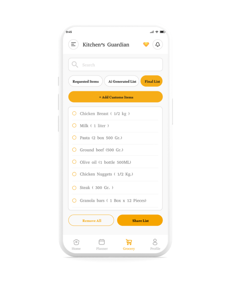 Easily generate smart grocery lists based on your meals, preferences, and pantry items—saving you time and reducing waste.